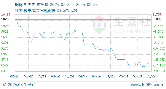 5月23日生意社棕榈油基准价为8546.00元/吨
