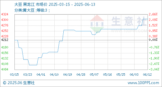 6月13日,生意社大豆基准价为4304.00元/吨,与本月初(4260.00元/吨)相比,上涨了1.03%。