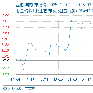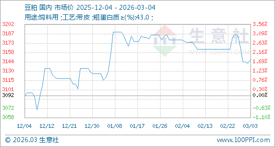 3月4日,生意社豆粕基准价为3148.00元/吨,与本月初(3144.00元/吨)相比,上涨了0.13%。