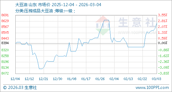 3月4日,生意社大豆油基准价为8610.00元/吨,与本月初(8530.00元/吨)相比,上涨了0.94%。