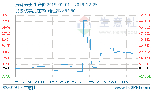 生意社化工分社黄磷分析师认为,2019年,在环保政策压力下,我国黄磷行业中较多生产企业停产,开工率无法得到大幅提升,黄磷市场是始终处于供应不足的状态,经过2次较大的波动,黄磷价格持续维持高位。黄磷价格长期高位盘整,下游贸易商多以观望为主,终端客户对高端价格抵触情绪明显,拿货较为谨慎,难以对市场形成有力支撑。12月底重点关注黄磷企业停产整改情况。随着贵州地区黄磷企业复产提上日程,预计2020年黄磷价格将有一定的下调空间。