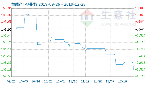 12月24日黄磷产业链指数为103.09,较昨日下降了0.82点,较周期内最高点124.27点(2019-07-24)下降了17.04%,较2018年10月07日最低点79.69点上涨了29.36%。(注:周期指2011-12-01至今)