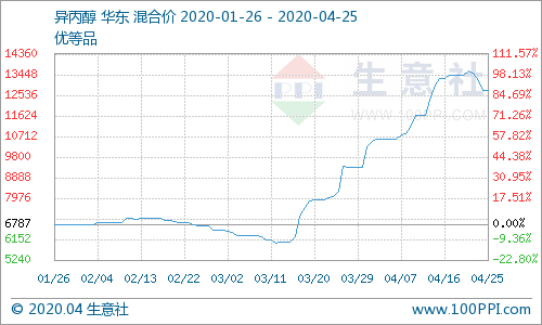 面对海外需求大增,异丙醇工厂开工率增加,对原料需求增加,拉动原料市场大幅上行。目前国内工厂生产异丙醇有3种工艺:丙烯水合法、丙酮加氢法及醋酸异丙酯氢化法,随着工艺日趋多元化,各工艺潜在的差异化也加剧了异丙醇行业的竞争。目前,国内异丙醇年产能约为84万吨左右,其中丙烯水合法占比25%左右;丙酮加氢法占比60%左右;醋酸异丙酯氢化法占比15%左右。以丙酮-异丙醇产业链为例,据生意社监测数据显示,以华东市场为例,春节过后市场需求低迷,运输受阻,二月份华东地区市场首先跌破5000元/吨,3月份,一只“黑天鹅”紧随其后,原油暴跌近30%,使整个石化板块遭受重创,丙酮也难以幸免,几个交易日华东地区丙酮市场跌至4200元/吨,眼看要破“4”的市场,下游消毒市场异丙酮拯救了大跌的丙酮,随着异丙醇需求大增,企业开工率不断提升,市场对原料丙酮询盘采购增加,对原料短期需求预期增加,3月17日丙酮华东地区三个交易日推涨600元/吨,华东地区报盘4750元/吨,在3月中下旬丙酮市场维持一段时间的相对高位运行,此阶段的走势脱离了石化产业链的重创打击,逆势上行。经过下游一段时间采购过后,虽然3月底丙酮依然无法逃脱上游原油和纯苯大跌成本利空影响,短暂下行,但进入4月份在原油预期减产利好提前释放和丙烯暴涨影响下,需求端有增无减,丙酮再次迎来大涨,截止4月22日丙酮市场持续高位,华东地区报盘6850元/吨,华北地区报盘6600元/吨,华南地区报盘7000元/吨。