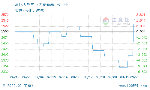 9月29日,内蒙古森泰天然气有限公司产能120万方/天,装置运行稳定,液化天然气价格2580元/吨,较上一交易日上涨30元,节前下游需求有所提升,淡季效应渐弱,内蒙地区普遍上涨,市场行情回暖。