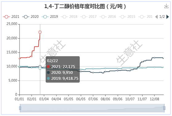 国内BDO市场行情持续大幅上涨。根据生意社监测的样本数据显示,截止2月22日,国内BDO生产者均价为22175元/吨,价格环比上涨67.04%,同比上涨122.86%。生产企业报价持续上涨,市场跟涨情绪高涨,短时间内BDO市场行情高位持续。