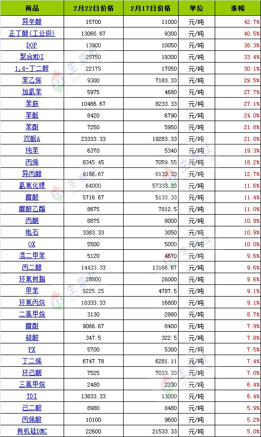 据生意社(100ppi.com)价格监测, 2021年2月17-22日大宗商品价格涨跌榜中化工板块环比上升的商品共60种,其中涨幅5%以上的商品共35种,占该板块被监测商品数的38%;涨幅前5的商品分别为异辛醇(42.7%)、正丁醇(工业级)(40.5%)、DOP(38.3%)、聚合MDI(33.4%)、1,4-丁二醇(30.1%),且涨幅均超过30%。紧随其后的当属苯乙烯、加氢苯、苯胺、苯酚、苯酐、双酚A和纯苯等,涨幅也超过20%。化工行业涨幅之大,不少产品再次刷新历史新高, “涨声”短期难停,但风险度明显增高,贸易商及终端采购需谨慎。