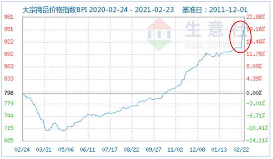 回首2020年,整个化工市场在2020年4月8日创下历史新低点(598点)之后,市场开始逐步复苏,据网盛生意宝旗下大宗商品数据商——生意社(100ppi.com)监测显示,2021年2月23日化工指数攀升至994点,较昨日上升了27点,较2021年1月1日化工指数840点上升了154点,较春节后2月17日化工指数875点上升了119点,节后一周市场涨幅超13.6%,可以看出,春节之后,原油带动化工板块急速上行,市场异常火爆,在成本、供应和需求多面利好下,几十种化工品涨幅可观。(注:周期指2011-12-01至今)