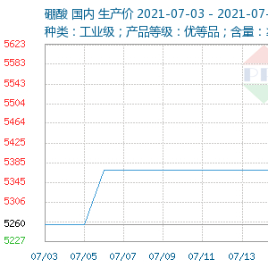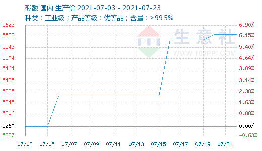 据生意社监测显示,本月硼酸价格上涨,7月3日硼酸均价5260元/吨,7月23日硼酸均价5590元/吨,均价较月初上涨330元/吨,涨幅6.27%。