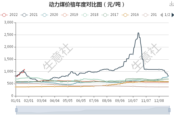 据生意社调查数据显示,动力煤在2021年的价格基本处于十年内高位水平,且十年最高价格出现在2021年10月20日,达到动力煤全年最高位2587.5元/吨左右,这也创立了一个历史价格。