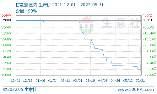据生意社大宗榜数据显示,5月国内甘氨酸价格延续跌势,工业级甘氨酸月初均价稳定在22333元/吨,月末均价21166元/吨,跌幅5.22%。