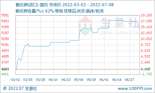 近期进口氯化钾国内市场价下跌。青海盐湖钾肥股份有限公司氯化钾设备运行正常。出厂价4480元/吨左右,报价暂稳,实际成交价以协商为主。近期国际氯化钾市场价格走低,国产库存量相对充裕,氯化钾价格下跌为主。