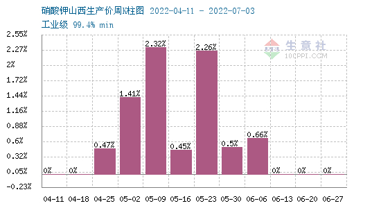 根据生意社监测的数据显示,周初山西工业级一等品硝酸钾报价7587.50元/吨,周末山西工业级一等品硝酸钾报价7737.50元/吨,上涨了0.66%,价格同比去年上涨了66.76%。