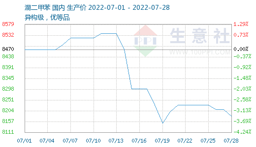 据生意社混二甲苯走势图可以看出,7月混二甲苯价格震荡下跌。截止7月28日混二甲苯价格8180元/吨,较月初7月1日混二甲苯价格8470元/吨下跌,跌幅3.42%。7月混二甲苯价格弱势震荡下跌,邻二甲苯成本下降,邻二甲苯下跌压力较大。