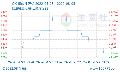 OX市场方面,本周华东地区OX价格下跌,周五(8月5日)华东地区OX价格在8000元/吨,价格较上周下跌3.61%,较去年同期上涨26.98%。