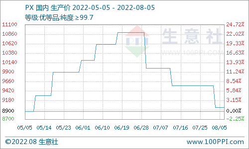 下游方面,PX市场方面,本周国内PX价格宽幅下跌,7月29日价格在9550元/吨,周五(8月5日)价格在9000元/吨,价格较上周下跌5.76%,较去年同期上涨23.29%。