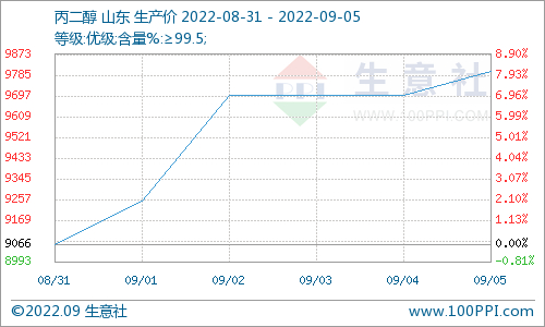 根据生意社监测数据显示,截止2022年9月5日,国产工业级丙二醇出厂均价参考在9800元/吨,与2022年9月1日(丙二醇出厂参考价格9250元/吨)价格相比,价格上调650元/吨,涨幅5.95%。