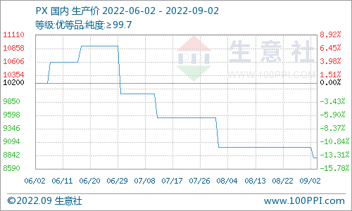 PX市场方面,本周国内PX价格下跌,8月26日价格在9000元/吨,9月2日价格在8800元/吨,价格较上周下跌2.22%,较去年同期上涨23.94%。