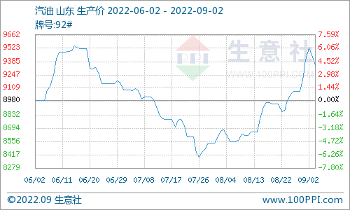 汽油方面,本周山东地区汽油涨后回落,8月26日价格在9073元/吨,9月2日价格在9347元/吨,较上周上涨3.02%,较去年同期上涨28.06%。