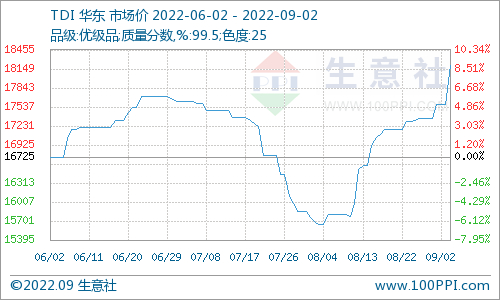 下游:TDI方面,本周华东地区TDI宽幅上涨,8月26日价格在17350元/吨,9月2日价格在18200元/吨,较上周上涨4.9%,较去年同期上涨26.1%。