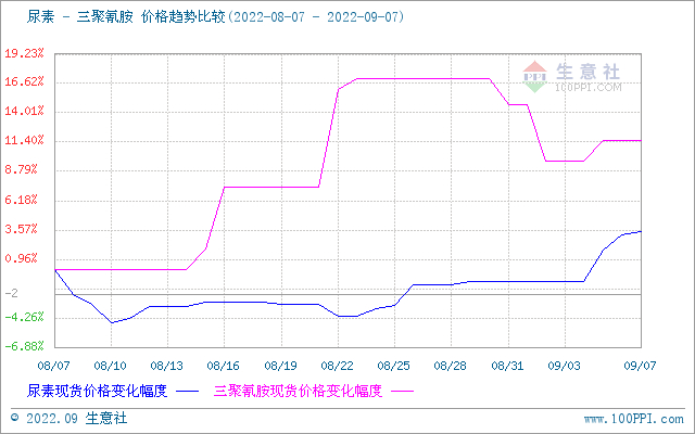 据生意社监测样本数据显示,截止到9月7日三聚氰胺企业均价为8066.67元/吨,与上周五(9月2日)价格相比上涨了1.68%,与8月7日价格相比上涨了11.52%,以三个月为周期同比下跌了16.55%。