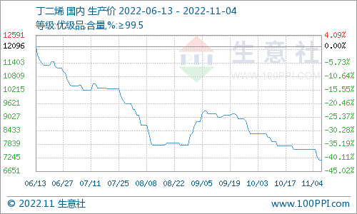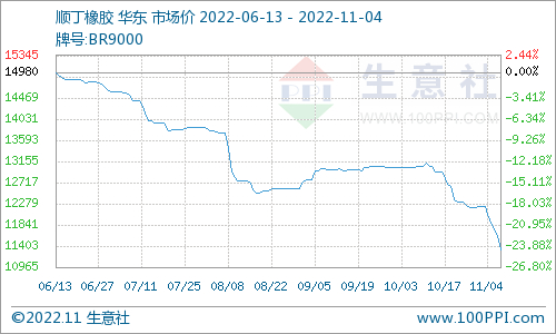 近半年来顺丁橡胶行情延续弱势价格走跌。进入11月顺丁橡胶加速下跌,国内生产企业顺丁橡胶出厂价三天内两次下调,幅度在800元/吨。据生意社了解,截至11月4日中石化华北销售分公司齐鲁顺丁出厂价在11100元/吨;据生意社监测,国内顺丁橡胶市场价在11330元/吨,较10月底下跌6.05%,较6月份的年内高点14980元/吨下跌24.73%。
