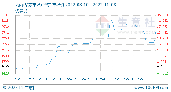 11月8日,生意社丙酮(华东市场)基准价为5800.00元/吨,与11月1日(5400.00元/吨)相比,上涨了7.41%。