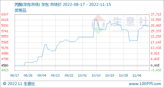 11月15日,生意社丙酮(华东市场)基准价为5930.00元/吨,与11月1日(5400.00元/吨)相比,上涨了9.81%。