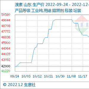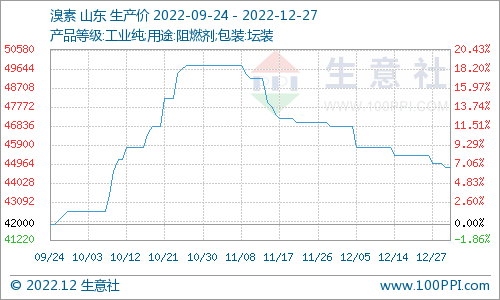据生意社大宗榜数据监测显示,溴素价格弱势运行。现在溴素市场均价为44800元/吨,较12月20日市场均价45400元/吨价格下跌1.32%,同比去年下跌15.7%。12月27日溴素商品指数为157.19,与昨日持平,较周期内最高点245.18点(2021-10-27)下降了35.89%,较2014年10月29日最低点58.92点上涨了166.79%。(注:周期指2011-09-01至今)。