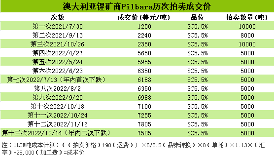 2022年锂矿价格也是不断上升,上游原料最惹人注目的便是拍卖价被称为”锂价风向标“的 Pilbara锂辉石精矿的拍卖。 从2021年7月30日的第一次拍卖至2022年12月14日最近的一次拍卖,锂辉石精矿的拍卖价格可谓是涨势迅猛,虽其中有两次拍价下调,但价格仍处于高位。