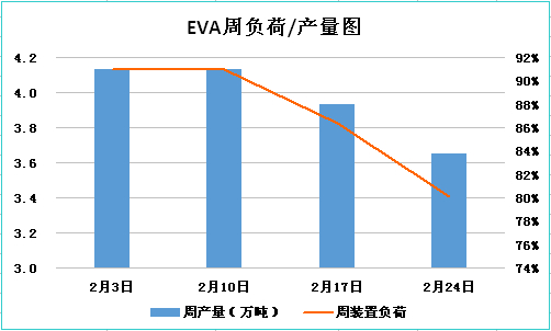 二月份,国内EVA生产企业负荷方面上半月高位稳定运行,行业开工率达91%。月中开始逐渐下调,截止月底行业开工率跌至80.1%。月内市场供应总体稳定,工厂库存压力较小,供方对现货存在一定支撑力度。厂家出厂价涨后僵持,拍卖货源价格先高后窄幅回落。主流牌号现货价格普遍上涨1000元/吨左右。