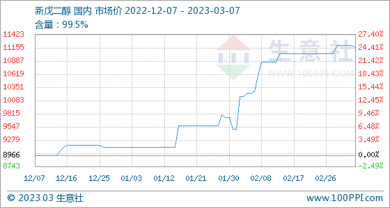 3月7日,生意社新戊二醇基准价为11166.67元/吨,与本月初(11033.33元/吨)相比,上涨了1.21%。