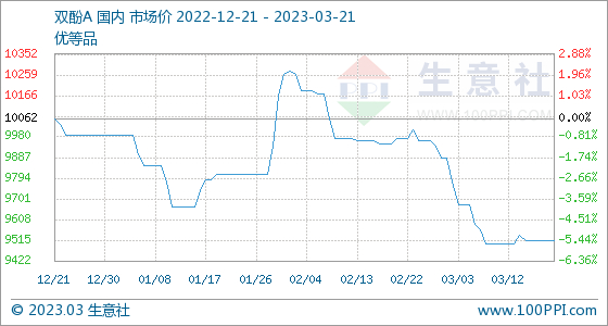 3月21日,生意社双酚A基准价为9512.50元/吨,与本月初(9887.50元/吨)相比,下降了-3.79%。