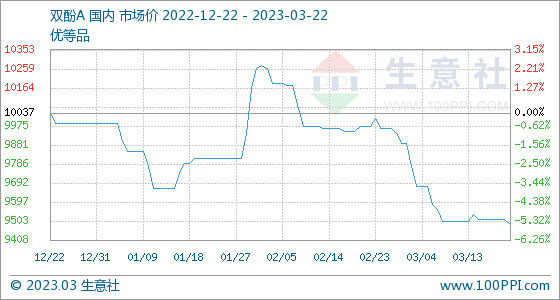 3月22日,生意社双酚A基准价为9487.50元/吨,与本月初(9887.50元/吨)相比,下降了-4.05%。