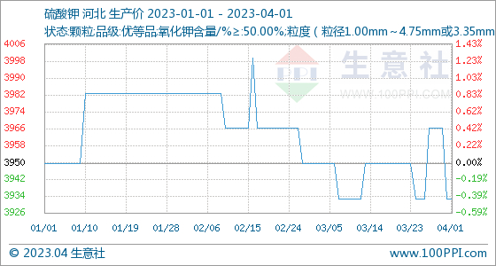 4月1日,生意社硫酸钾基准价为3933.33元/吨,与上月初(3950.00元/吨)相比,下降了-0.42%。