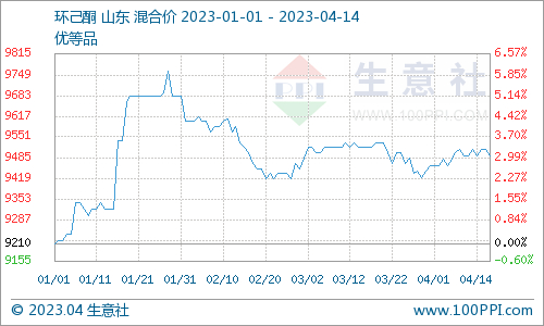 据生意社商品行情分析系统,国内环己酮市场行情涨后整理。4月7日至14日,国内环己酮市场均价自9510元/吨下跌至9490元/吨,周内跌幅0.21%,价格环比下跌0.28%,同比下跌15.52%。纯苯市场震荡运行,成本面支撑稳定。下游需求偏弱,市场高价出货受阻,成交重心走弱,环己酮市场弱势整理运行。
