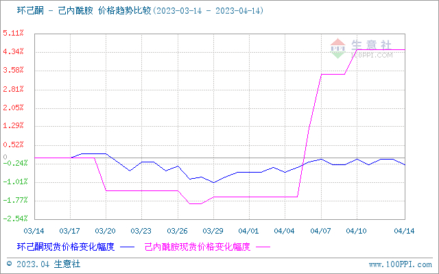 生意社环己酮价格与己内酰胺(下游产品)走势比较图: