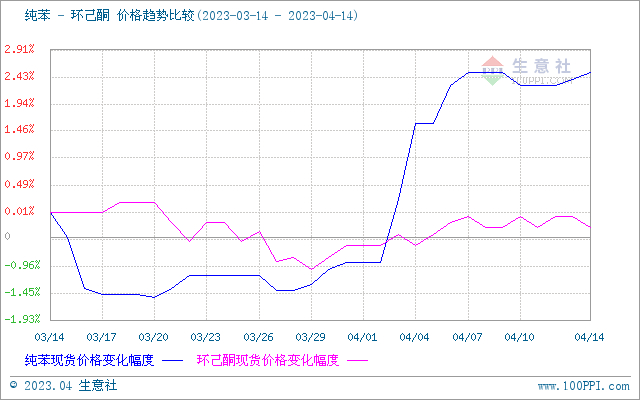生意社纯苯(上游原料)与环己酮价格走势比较图: