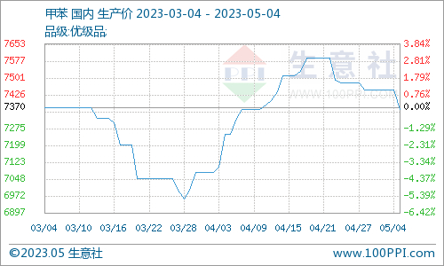 原油方面,5月4日,美联储如期加息25个基点,鲍威尔新闻发布会讲话暗示将暂停加息;5月1日美国第一共和银行倒闭,银行业危机再次袭来,市场恐慌情绪蔓延;近期宏观避险情绪浓厚,油价走低,甲苯基本面支撑不足,近期弱势运行。