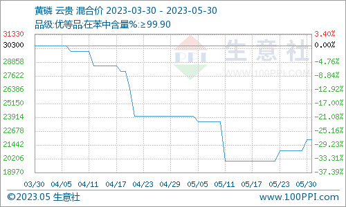 5月黄磷市场价格先跌后涨,整体来看行情下调。本月上旬,整体市场交投情况不佳,厂家多不对外报价,观望氛围较浓,买盘积极性不高,实单详谈。本月中旬价格维稳为主,市场价格成交有限。本月下旬目前黄磷在产企业多降负荷生产,部分企业停车,延缓开车时间,企业挺价,市场现货略显紧张,价格有所反弹。截止目前四川地区报价在21800-22000元/吨左右,实际成交一单一议。