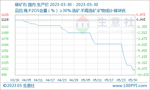磷矿石方面,生意社数据监测显示,截止2023年5月26日,我国30%品位磷矿石参考均价在1020元/吨附近,与2023年5月1日(磷矿石参考价格1090元/吨)相比,价格下调70元/吨,跌幅6.42%。当前,磷矿石场内交投气氛一般,场内观望情绪较浓,供需间有小幅博弈气氛出现,生意社磷矿石数据师认为,短期内,国内磷矿石市场行情多窄幅调整运行为主,具体走势还需多关注供需面的消息变化。