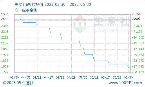 焦炭方面,5月焦炭市场共计5轮提降,累计降400元/吨,第九轮提降落地后,目前焦化企业利润普遍下滑,但企业开工率让保持在74%左右水平,目前焦炭供应依旧平稳。需求方面随着天气转暖,多数地区进入雨季,成材市场逐步进入季节性淡季,钢厂盈利水平下滑,对焦炭目前多维持刚需采购,部分库存充足厂家有控制到货的情况,对焦炭仅维持按需补库。综合来看目前下游进入淡季,需求预期不足,焦炭市场气氛整体偏弱,预计短期内将保持偏弱运行为主,后续重点关注焦化企业开工情况,以及各环节焦炭库存情况。
