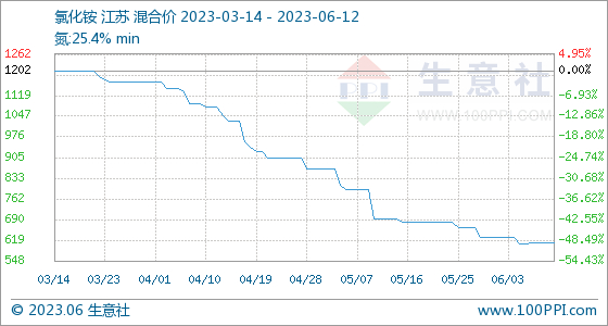 6月12日,生意社氯化铵基准价为610.00元/吨,与本月初(627.50元/吨)相比,下降了-2.79%。