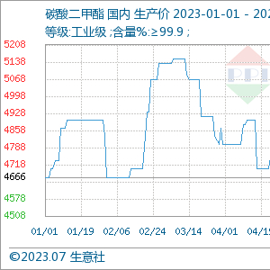 根据生意社监测数据显示,截止2023年6月30日,国产工业级碳酸二甲酯出厂价格参考在4900元/吨,与2023年1月1日(碳酸二甲酯参考价格4666元/吨)相比,价格上调234元/吨,涨幅8.57%。
