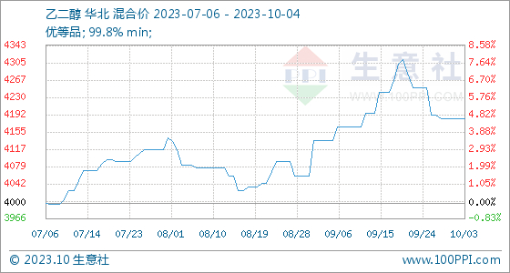10月4日生意社乙二醇基准价为4183.33元/吨