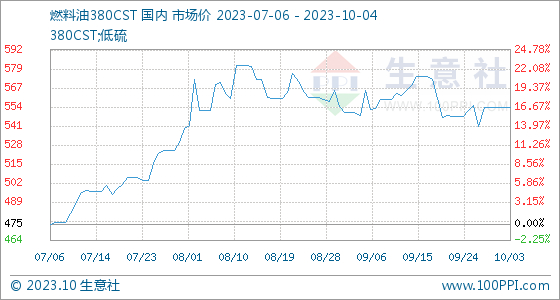 10月4日,生意社燃料油380CST基准价为554.00美元/吨,与本月初持平。