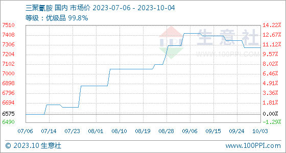 10月4日,生意社三聚氰胺基准价为7275.00元/吨,与本月初持平。