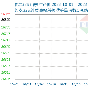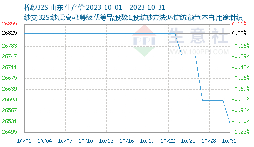 10月棉纱行情下跌,市场报价较为混乱,纱厂和经销商低价抛货重心继续下探,据生意社商品行情分析系统,10月31日山东地区32支棉纱现货价格在26525元/吨,较月初下跌1.12%。