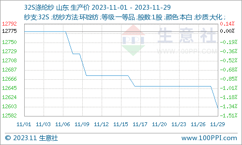 需求端,终端需求不振,下游纱厂对后市持悲观情绪,仅维持少量刚需采购。纺企普遍反馈纱线滞销,产品库存持续增加,小幅降价去库仍为主旋律。11月末山东地区纯涤纱市场参考价格报12600元/吨,较月初下跌1.37%。各地区纱厂开机率有所下调,其中新疆大型纱厂平均仍可达八成左右,河南、江浙、山东、安徽等地区的大型纱厂平均开机率在65%左右,中小型纱厂开机率在50%左右。
