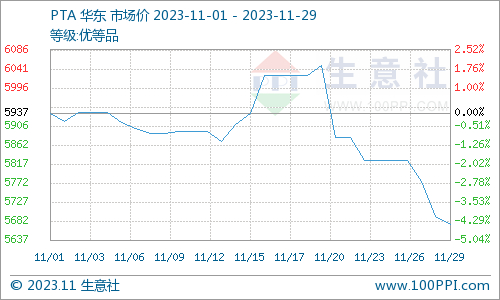原料PTA货源供应充足,随着前期检修装置陆续重启,行业开工负荷提升至82%以上。另外,11月份逸盛海南250万吨/年PTA装置中的125万吨新产线已经投产,预计于11月底投产另外的125万吨/年产线。2023年前11个月PTA新增产能达1500万吨,创历史年度扩能纪录,对PTA市场形成拖累。但终端表现好转之下,一定程度缓冲PTA价格下行压力。截止11月29日华东地区现货市场均价在5675元/吨,较月初下跌4.41%。
