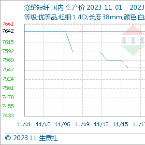 据生意社商品行情分析系统,11月国内涤纶短纤市场行情震荡下行,截止11月29日江浙主流工厂1.4D*38mm均价在7452元/吨,较月初下跌2.49%。